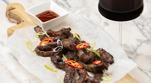 Bestrijk de ribs met de roasted garlic saus en roostere ze circa 10 tot 12 minuten krokant in een voorverwarmde oven op 180 graden. Snijd vervolgens de bosui en rode peper in schuine ringetjes en doe de Japanse sesamsaus in een tipje.